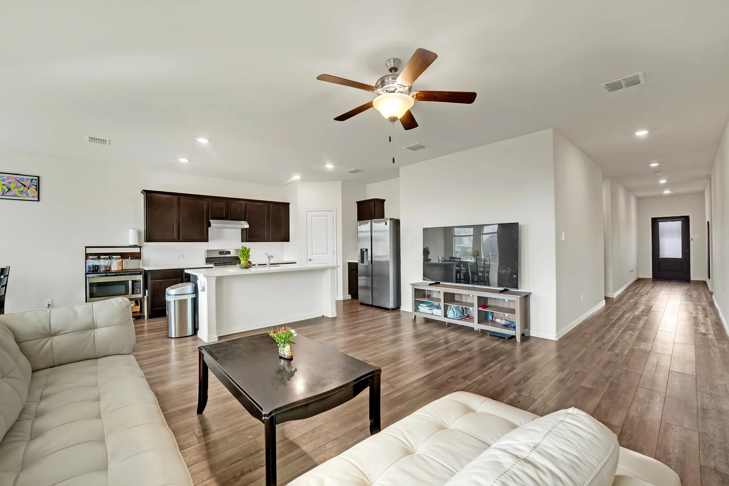 Open-concept floor plan connecting living, dining, and kitchen areas